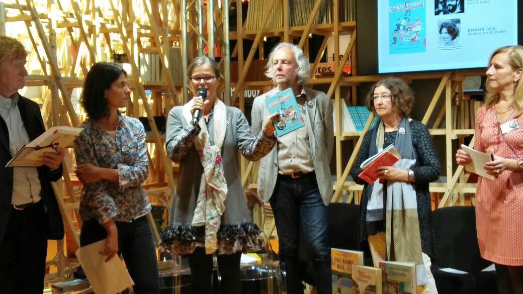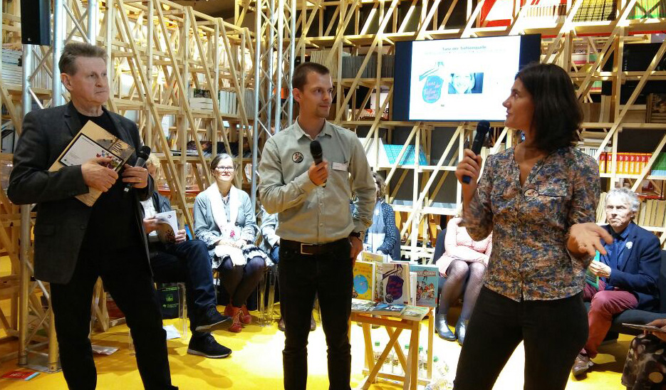 Par la suite, Kai Mühlek a engagé la discussion avec Isabelle Enderlein, membre du jury et traductrice littéraire ainsi qu’avec l’éditeur Michael Neugebauer (minedition) qui a publié en allemand « Les jours noisettes » – « Haselnusstage » – d’Emmanuel Bourdier, lauréat du Prix en 2015.